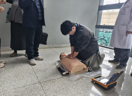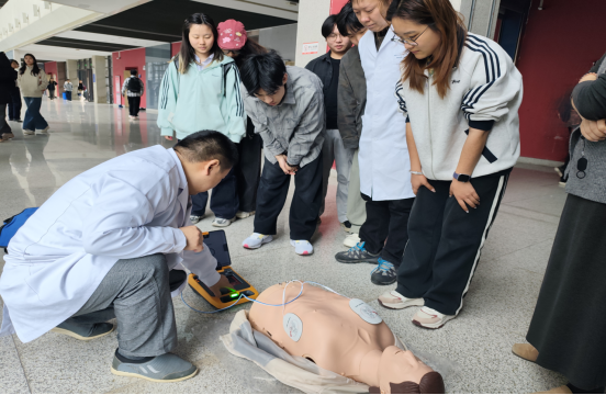 在实操环节,专业医师现场介绍了AED整机外观结构及各个配附件的功能、开机、电极片粘贴、放电等操作步骤及注意事项、肺复苏的胸外按压、人工呼吸等操作技能,并模拟演练急救场景,提高了师生应对突发情况的能力。